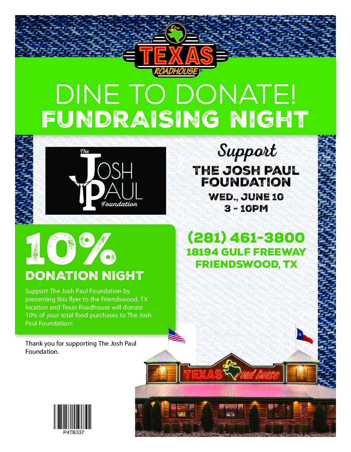 Texas Roadhouse Dine 2 Donate June 10th, 2026 – Come out to eat or grab dinner to go with The Josh Paul Foundation at Texas Roadhouse (Gulf Fwy/Friendswood Location).