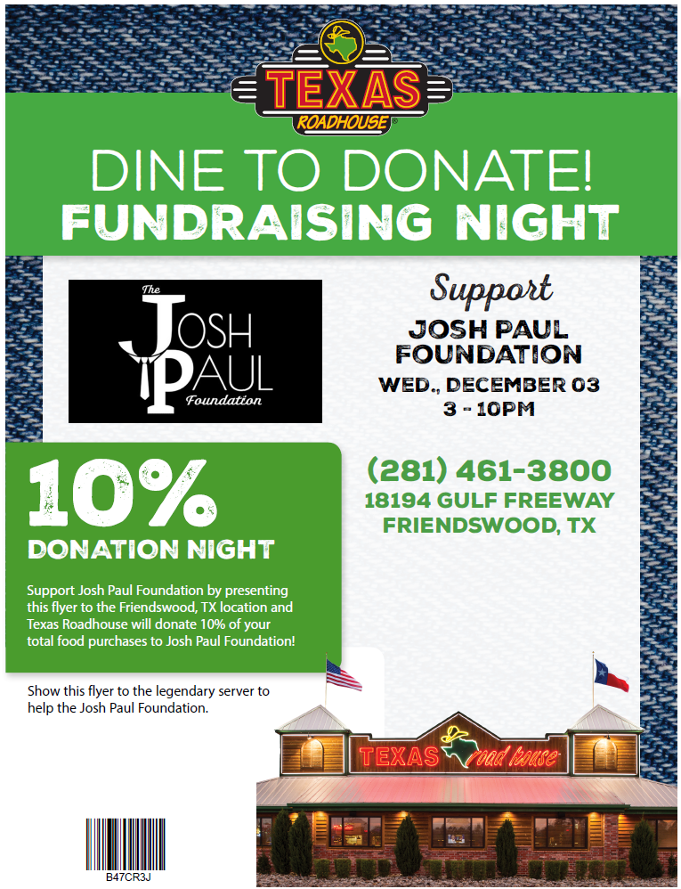 Texas Roadhouse Dine 2 Donate Dec 3 2025 – Come out to eat or grab dinner to go with The Josh Paul Foundation at Texas Roadhouse (Gulf Fwy/Friendswood Location).